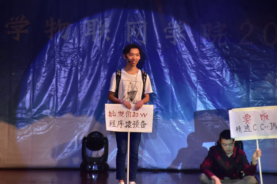 本场晚会语言类节目最为出彩。节目《程序员的自我修养》通过新生与毕业生的对话,深刻揭示了梦想和现实之间的矛盾,其中的俏皮对话折射出“码农”的辛苦,引发众多毕业生的共鸣,结束语“Hello,world!”既与公司特色相结合,又展现了毕业生朝气蓬勃、敢想敢做的精神,引起场下观众阵阵掌声。话剧《表白暗恋》采用别出心裁的上下篇方式,将同学们四年老员工活娓娓道来,贴近生活化的流行语引导台上台下互动,一度将晚会推向高潮。