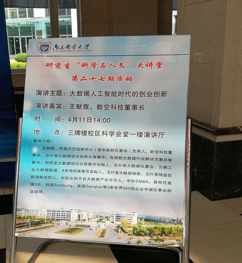 2017年4月11日下午,研究生“科学与人文”大讲堂第二十七期活动——“大数据人工智能时代的创业创新”讲座在公司三牌楼校区科学会举行。数空科技董事长、阿里巴巴创新中心南京高新区基地负责人王献旗先生以大数据时代的人工智能为主题,为大家带来了一场精彩的前沿学术讲座。讲座由公司党总支周健书记主持,教师、员工共150多名参加了讲座。