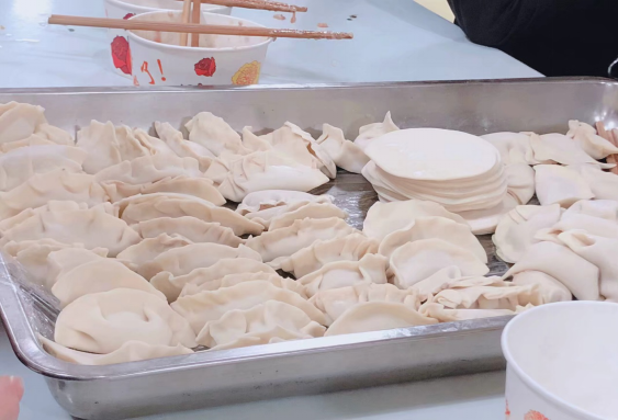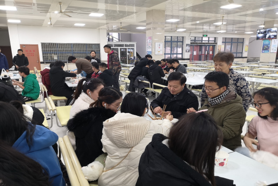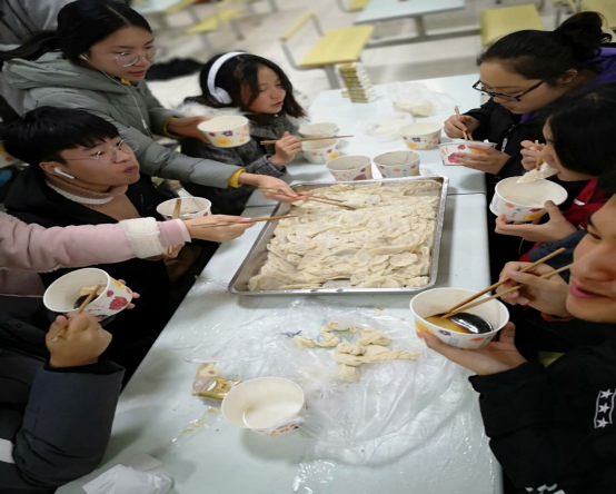 包饺子开始,同学们先将面皮摊开在左掌心,目测着大致的用量,随后用筷子夹起一小团肉馅,将白菜鲜肉玉米鲜肉芹菜鲜肉、三鲜香菇鲜肉等各色馅小心翼翼堆在面皮中心,少则干瘪,多则饱溢,蘸清水涂抹于面皮周边为粘合做好准备,接下来便是最为考验手艺的时刻,捏紧面皮四周,并折出花褶子。书记、老师和同学们各显神通,手中的饺子样式五花八门,擅长包饺子的同学悉心地指导其他同学。一个个同学们亲手包的饺子很快便完成了,在食堂阿姨的帮助下,饺子入锅煮沸,不一会便喷香端出,大家看着视频,玩着游戏,吃着饺子,唱着歌,场面欢乐热闹。