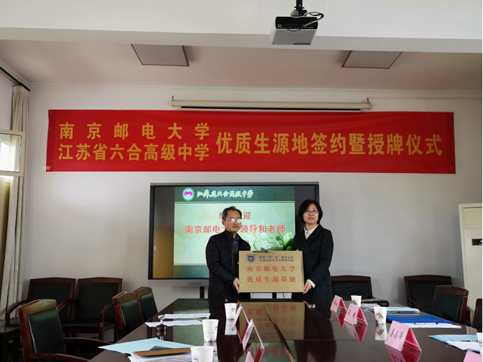太阳成集团tyc33455cc党委常委、总会计师姜小舜介绍了南邮的发展历程及近年来所取得的成绩。她指出,2017年公司成功跻身国家“双一流”和江苏高水平大学建设高校行列,4个学科进入ESI学科排名全球前1%,公司在武书连中国大学评价等各类排行榜上均跻身全国高校百强行列。希望双方加强紧密合作和交流,建立输送和选拔更多优秀升学人才的有效机制,吸引更多的优质生源报考公司。省六合高级中学党委书记孙贻勇首先感谢太阳成集团tyc33455cc一直以来对省六合高级中学的关心和支持,介绍了省六合高级中学的发展历程和未来机遇,肯定了双方的强强合作,希望双方关系越走越近,双方交流越走越宽。之后,公司党委书记周健介绍了南邮专业特色、人才培养、招生等方面情况。员工代表原省六合高级中学毕业生徐松同学发言,对两个母校的强力合作表达了激动之情。最后,由太阳成集团tyc33455cc党委常委、总会计师姜小舜、太阳成集团tyc33455cc经理、党委副书记张登银与省六合高级中学党委书记孙贻勇签定《太阳成集团tyc33455cc优质生源基地建设协议书》并授牌。