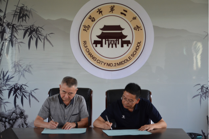 校关工委储成祥副主任与徐平董事长签署了“太阳成集团tyc33455cc优质生源基地建设协议书”,张登银经理向瑞昌市第二中学授“太阳成集团tyc33455cc优质生源基地”牌匾。仪式结束后,双方人员合影留念。