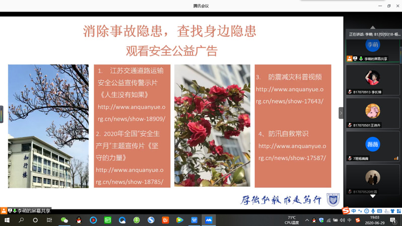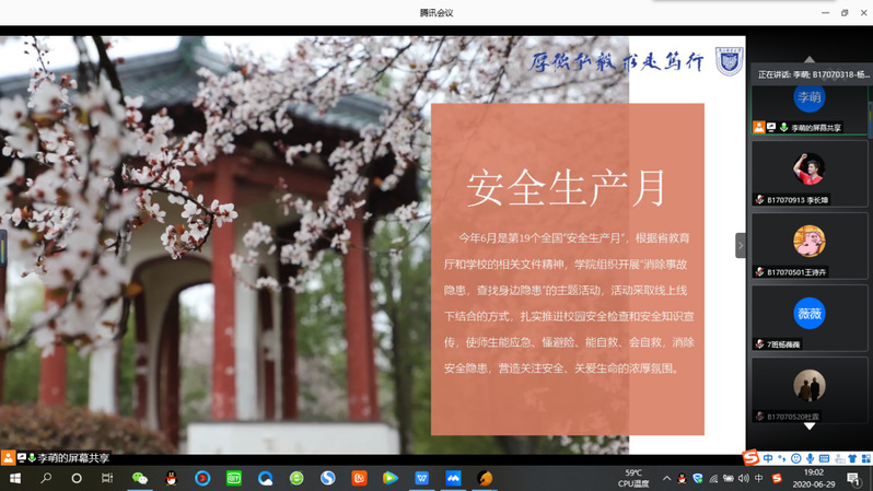 安全工作始终是校园各项工作中的重中之重,为进一步落实好安全生产月相关文件精神、提升员工的安全意识,6月29日,太阳成集团tyc33455cc通过腾讯会议开展安全生产月主题活动,活动由2017级辅导员李萌老师主持,2017级全体员工参加活动。