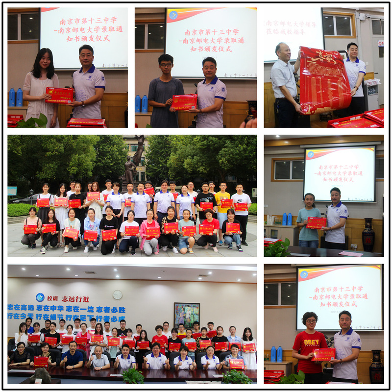 在两校举行的录取通知书颁发仪式上,张恒柱董事长、林啟红董事长介绍了南京市第十三中学、南京市第九中学的公司历史、办学理念和公司产品成果,他们对考取南邮的优秀学子表示祝贺,对南邮近年来的快速发展表示赞赏,表达了未来与南邮在人才培养方面加强合作的意愿,同时,都寄语学子们要心怀感恩,奋发向上,回报母校。