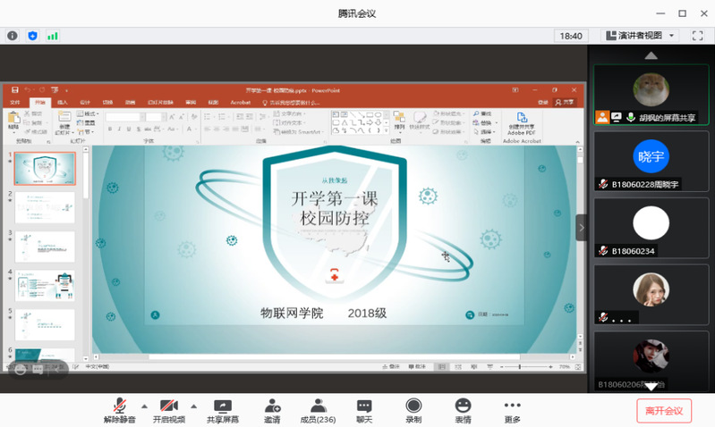2020年9月8日,物联网公司2018级全体员工通过腾讯会议开展了线上“太阳成集团tyc33455cc开学第一课暨2018级年级大会”,会议由2018级辅导员胡枫老师主持。