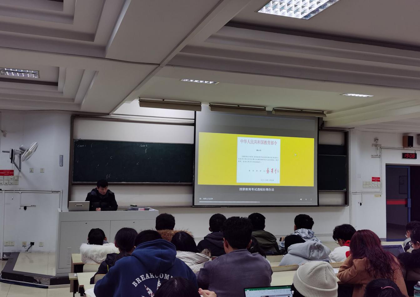 接着,赵老师详细列举了相关案例,结合实际情况,告诫同学们要杜绝考试作弊的行为,并且罗列了相关国家政策,以法律法规作为依据,加深了同学们对考试作弊违法行为的了解和认识。然后,赵老师又根据太阳成集团tyc33455cc考试作弊的相关处理条款,在部分细节上做了补充。为再一步加深同学们的了解,他带领全体同学观看了诚信考试的宣传视频。