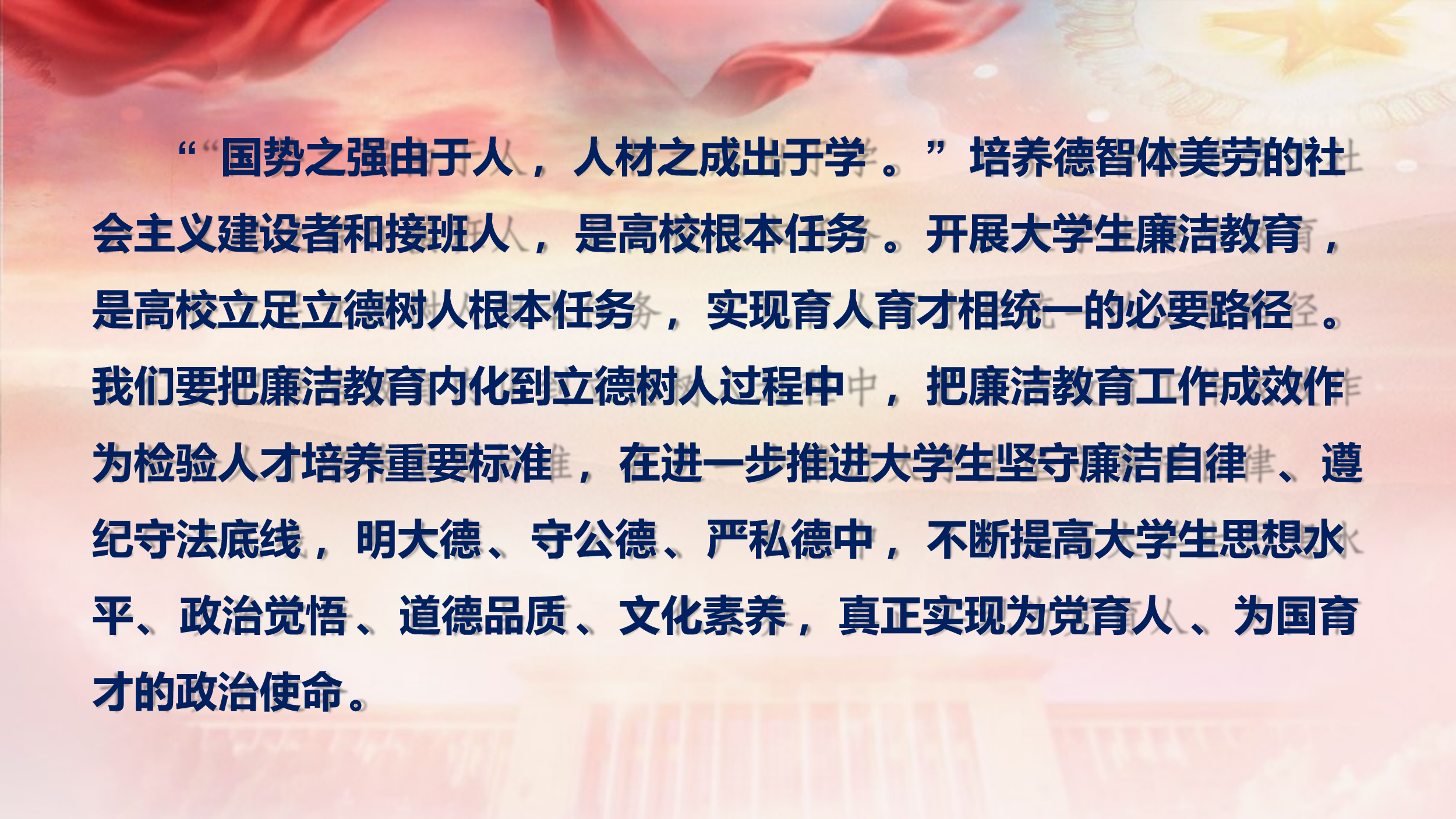 “国势之强由于人,人材之成出于学。”我们要把廉洁教育内化到立德树人过程中,把廉洁教育工作成效作为检验人才培养重要标准,努力引导员工坚守廉洁自律、遵纪守法底线,明大德、守公德、严私德中,不断提高员工思想水平、政治觉悟、道德品质、文化素养,真正实现为党育人、为国育才的政治使命。