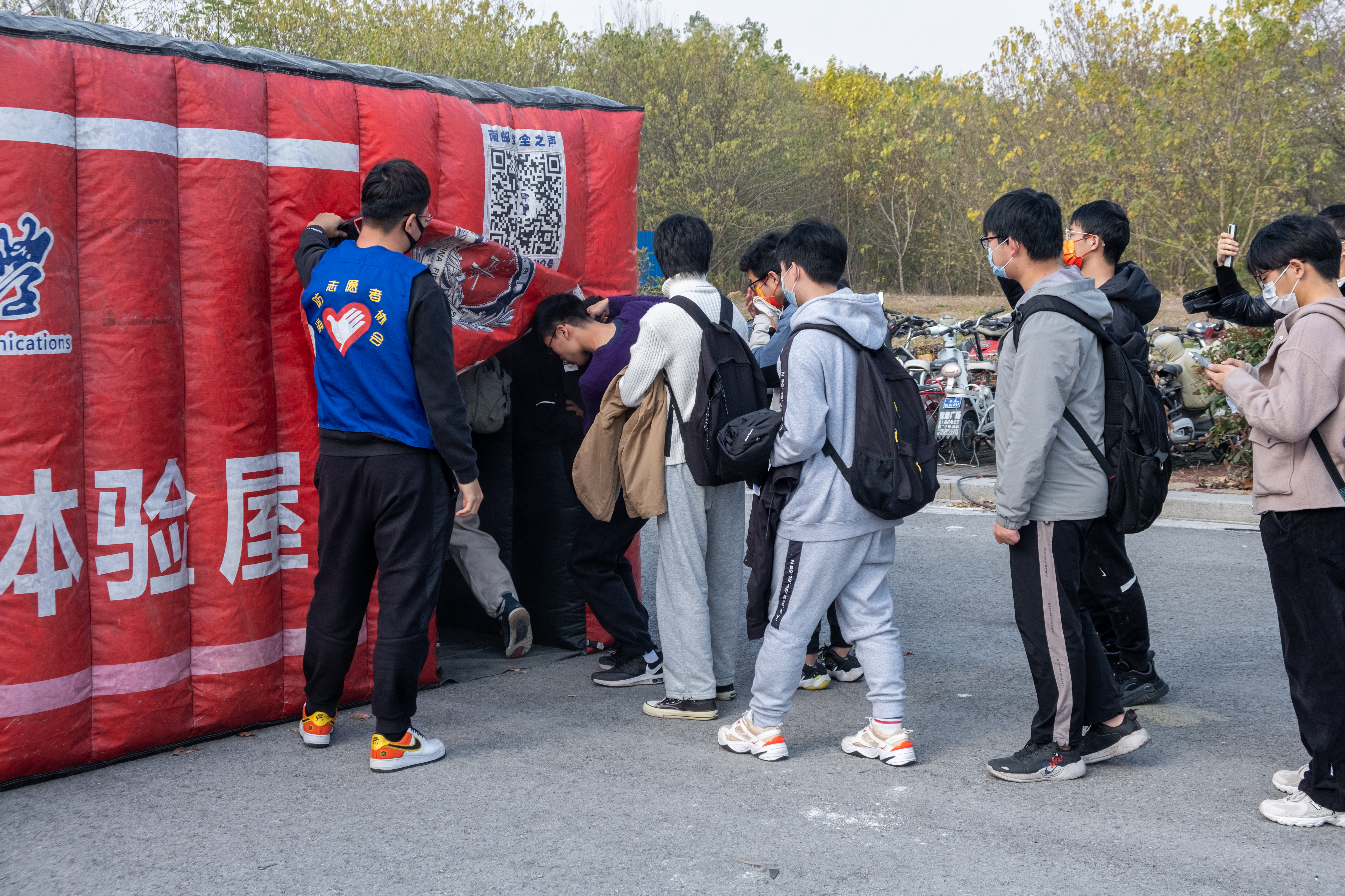 中午12点10分,演练活动开始,首先同学们有序排队进入消防模拟逃生体验屋,在专业人员的指导下,同学们安全的走出了体验屋。随后由志愿者教授了干粉灭火器的使用技巧和注意事项,同学们轮流操作,最终熟悉掌握了灭火器的使用方法。