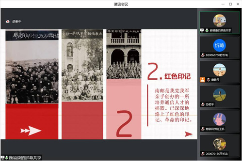 “伟大的战邮精神,永远激励着一代又一代的邮电人不畏艰难、无私奉献、团结拼搏、勇往直前。”课程伊始,颜老师首先向同学们讲述了战邮干训班的成立背景,从四月始源、红色印记、史久源悠、援手同门、育英三叠、一脉根深、邮电情结、师者如兰、柚子风采、飞鸿奋翅等十个方面全面回顾了南邮的办学历程和取得的辉煌成就。