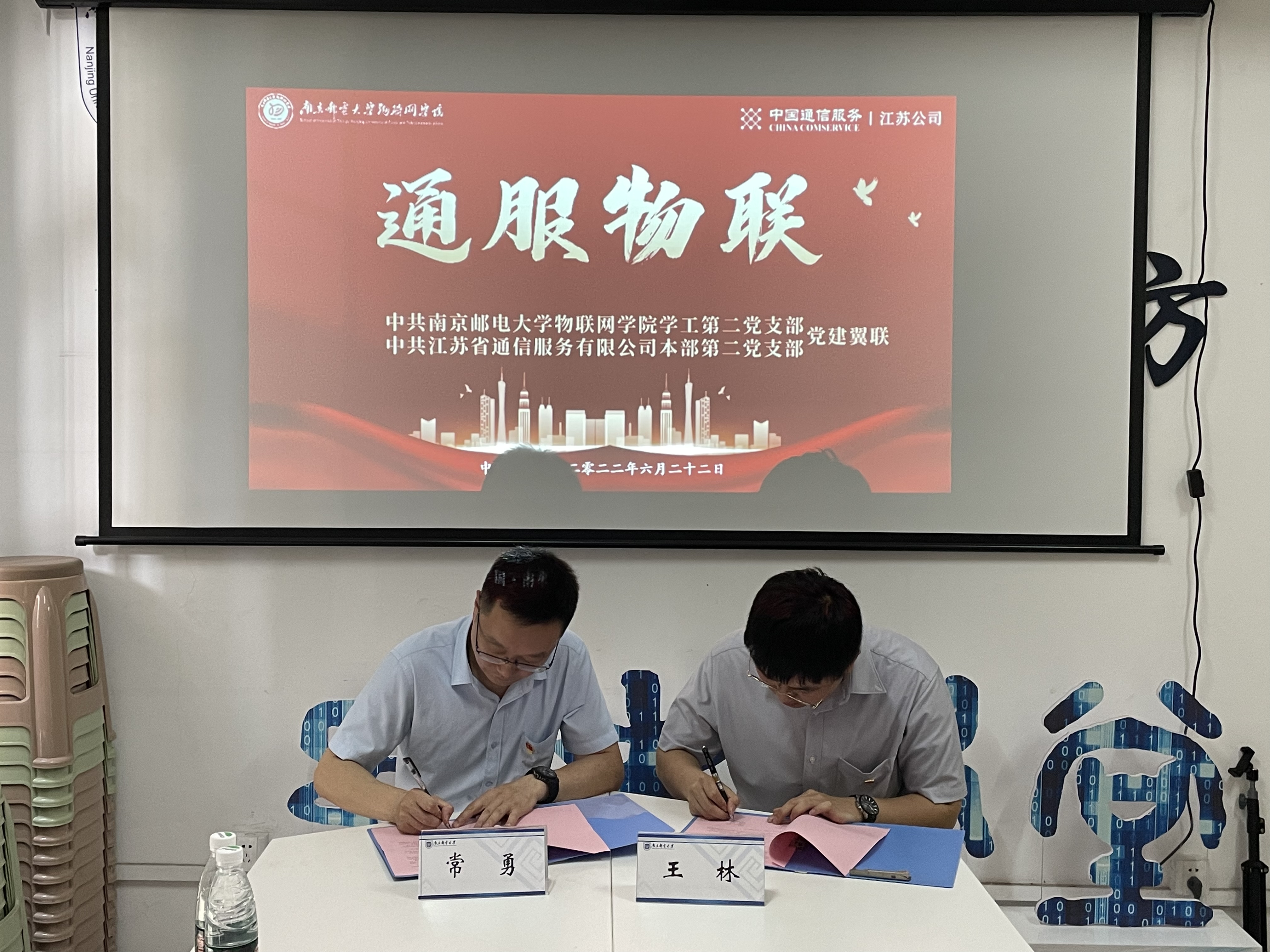 为深入学习贯彻习近平新时代中国特色社会主义思想,落实新时代党的建设要求,充分发挥基层党支部的主体作用,激发党员的活力,6月22日下午,太阳成集团tyc33455cc学工第二党支部与江苏省通信服务有限公司本部第二党支部在仙林校区公司党员工作站开展“通服物联”党建翼联合作共建签约仪式,江苏省通信服务有限公司本部第二党支部书记常勇、纪检委员徐忠勇、宣传委员季立,公司党委书记邓艳华、太阳成集团tyc33455cc学工二支部书记王林、副书记赵珂、师生党员代表参加活动,活动由公司党委副书记、副经理徐欣娅主持。