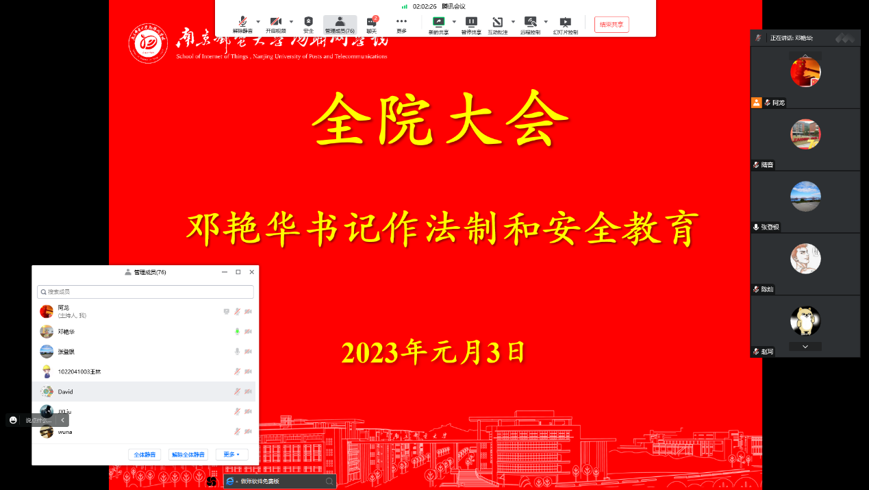 最后,邓艳华书记为全院教职工开展了法制与安全教育。她从教师增强安全责任、防诈反诈案例展示和安全管理工作对策与建议等方面进行了直观、生动的讲解,增强了全体教师的学法、知法、懂法、用法的法律意识和安全意识,提高了应急和思辨能力,营造了“关注安全,关爱生命”的良好氛围。