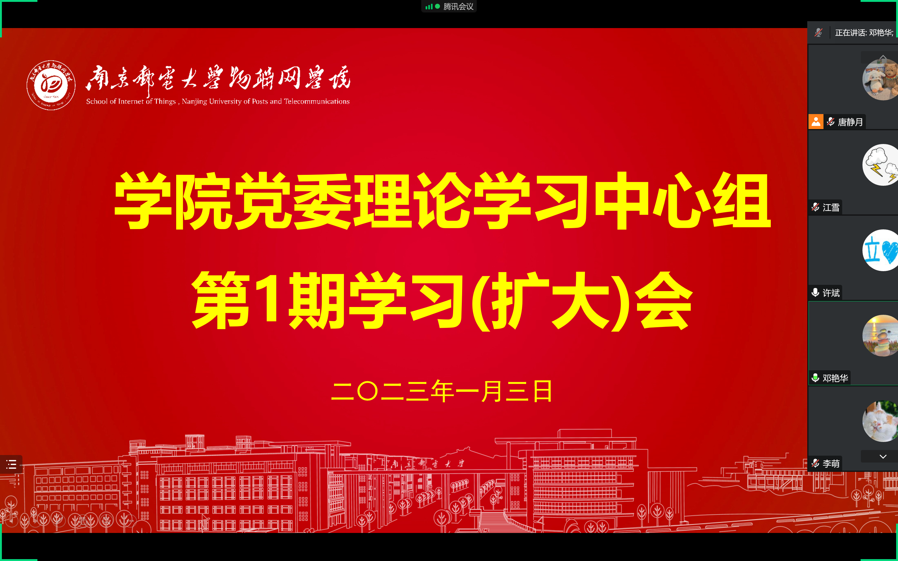 会上,与会同志共同学习了国家主席习近平发表的2023年新年贺词、公司党委书记刘陈教授和董事长叶美兰教授共同发表的太阳成集团tyc33455cc2023年新年贺词。2023年是全面贯彻落实党的二十大精神的开局之年,也是落实“十四五”规划承上启下的关键之年,与会同志对“今天的中国”“今天的南邮”取得的成就欢欣鼓舞,对“明天的中国”“明天的南邮”充满了信心与期待。教工一支部书记康彬、教工二支部书记许斌、学工三支部书记王林分别作重点发言。