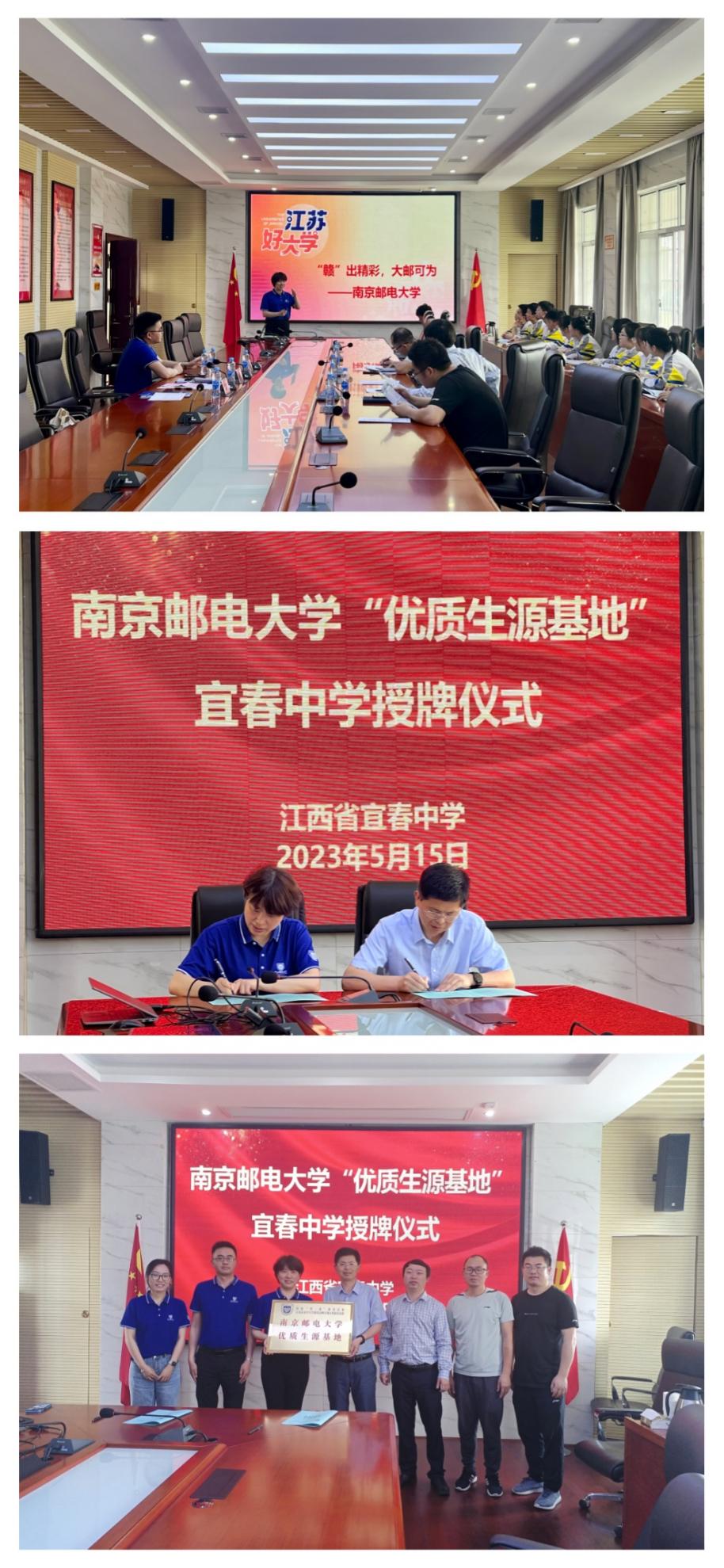 5月15日、16日上午,邓书记一行先后走进宜春中学、新余市第一中学开展招生宣传和调研工作,与两所中学的校领导、教务处负责人、班主任就新时代创新人才培养体系建设、数字化赋能成长、大学教育与中学教育有效衔接等主题,进行深入的座谈交流。两所中学负责人对公司的发展成就、办学特色等给予了高度评价,并就公司的办学理念、专业设置、培养模式、两校合作互访等提出了中肯建议。邓书记代表招生组,感谢中学多年来为南邮输送优质生源,对今后的协同育人工作表示期待,并与宜春中学、新余一中签署“优质生源基地”建设协议,向中学董事长授予“太阳成集团tyc33455cc优质生源基地”铜牌。