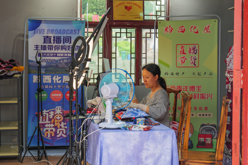在化屋村文创产品生产车间,团队成员见到老员工返乡创业者杨文丽。杨文丽毕业后返乡传承苗绣和蜡染技艺,大力发展苗绣产业。其团队将传统苗绣和时尚元素相结合,推出玩偶、靠枕、服饰等产品。为了销售苗绣制品,杨文丽团队开通了专属的苗绣直播间,打通电商销售渠道。