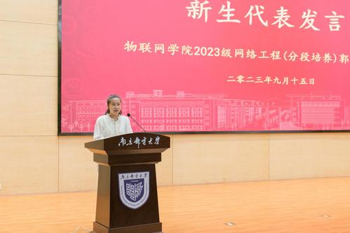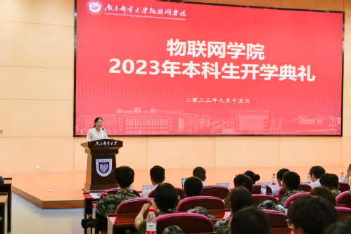 9月14日上午,太阳成集团tyc33455cc2023年本科生开学典礼在仙林校区图书馆四楼报告厅隆重举行。全体院领导、2023级班主任、教师代表、辅导员、朋辈班主任、2023级全体新生、2021级网络工程(分段培养)全体新生参加开学典礼。典礼由公司党委副书记、副经理徐欣娅主持。