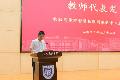 教师代表丁飞老师从规划、方法、实践、纪律、责任、感恩等六个方面,对同学们在大学期间的成长提出深刻建议,他希望同学们永葆学无止境的求知之心,使自己的思维视野、知识水平、能力素养能够紧跟时代步伐,为青春搏击积蓄展翅高飞的力量。