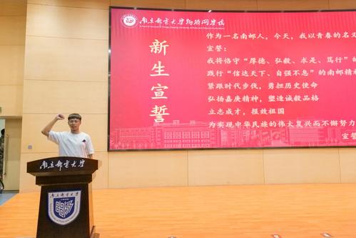 在新生代表申珉贤同学的带领下,全体新生紧握右拳,郑重宣誓,青春的誓言催人奋进,鼓舞着在场每一位同学。