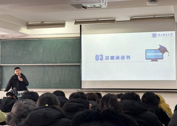 首先,于老师对近期年级的学习和生活的整体情况做出总结,肯定了员工们积极进取的学习态度和昂扬向上的生活态度,让同学们对辅导员工作有了进一步认识,随即开展了辅导员与班主任的面对面测评。其次,于老师结合案例介绍了关于诚信考试及考试作弊的惩处方案,引导同学们要切实做学问,而不是投机取巧,警示了同学们要严守诚信考试底线,遵守考试纪律。接着,于老师带领同学们签署了诚信考试承诺书并进行诚信考试宣誓。最后,在交流互动环节,高熙翔、赵恒璐、姚博文、茆天爱等同学发表了对近期学习和生活的心得体会以及对期末阶段和寒假期间的规划,于老师还对同学们的期末规划做出了指导,解答了同学们存在的疑惑,理清了学习思路,并寄语同学们要认认真真做学问,踏踏实实做人,为自己的老员工活增色添彩。