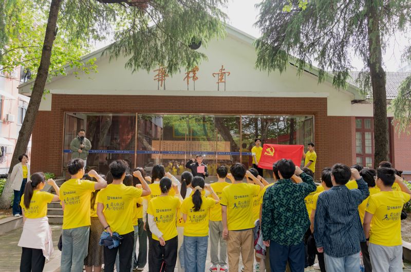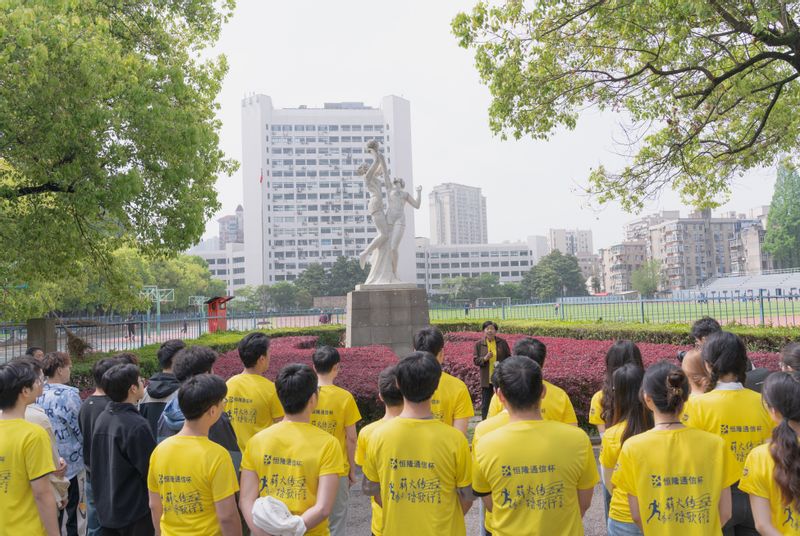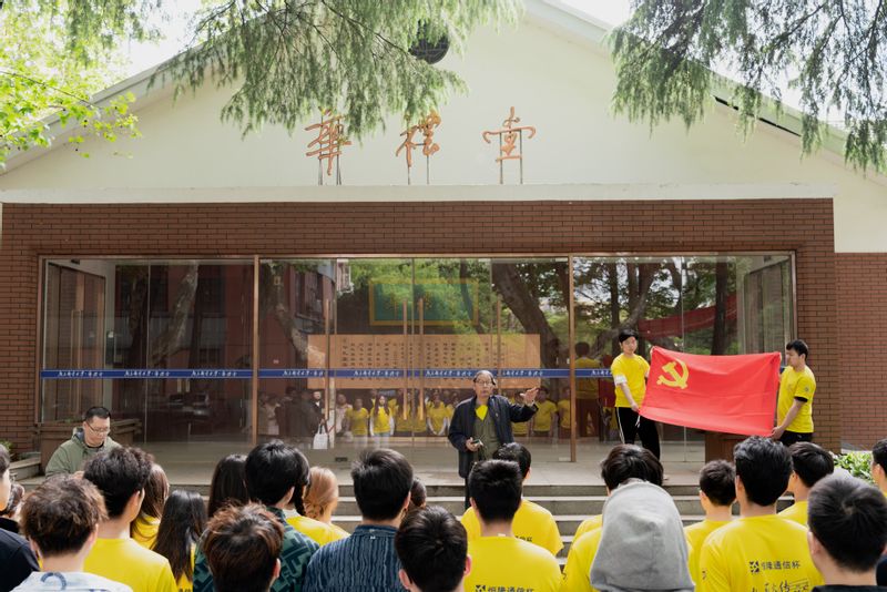 师生们首先来到华礼堂前。南邮校史编委会编委颜福康老师率先开讲,他深情地阐述了校庆日期的由来,讲述了公司四个重要历史节点,都与四月份的深厚渊源。公司最终确定校庆日是4月20日,这一天成为了南邮人共同的记忆与骄傲。公司关工委副主任马名骞老师为大家细述华礼堂的变迁史,“华礼堂原名小礼堂,建于1953年,从最初的茅草顶棚到后来的砖瓦结构,再到今天修缮一新,它承载了一代代南邮学子的青春记忆,它见证了南邮从中专教育起步,迈向电子信息领域特色鲜明的世界一流大学的发展历程。”马名骞老师接着介绍:“为了传承公司红色基因,铭记老红军、南邮首任党委书记兼经理秦华礼为公司发展做出的杰出贡献,2018年4月,公司将小礼堂以秦老名字命名‘华礼堂’,当时106岁的秦老亲笔为华礼堂题匾,并与时任校领导、捐资修缮礼堂的员工毛辉共同为华礼堂揭牌。”