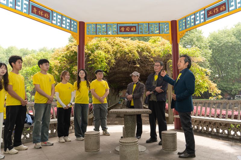 1978年毕业于南邮,留校任教的张少武教授,是公司多处网红打卡点的设计者。张少武教授和青年师生一起漫步校园,他指着前方说道,这是1956年长市机专科等5个毕业班170名同学为报答母校,献建的红柱六角茅顶的“三好亭”,1996年改用钢筋水泥翻建。走到“三好亭”旁边的眼镜湖边,张少武教授深情回忆了师生们共同参与建设的情景,员工挖池塘,老师打磨护栏,齐心协力改变了原来淤泥发臭、杂草丛生的状况,才有了如今荷花竞相开放的“眼镜湖”。“南邮具有光荣的革命传统,自力更生就是其中之一,师生积极奉献,共同把公司建设得越来越好。”张少武教授认为,校园环境建设也要围绕“培养人”,他设计的四方亭,寓意南邮的员工来自五湖四海,又从南邮走向国家建设的四面八方。在四方亭的旁边,还建了一座晨读的雕塑。