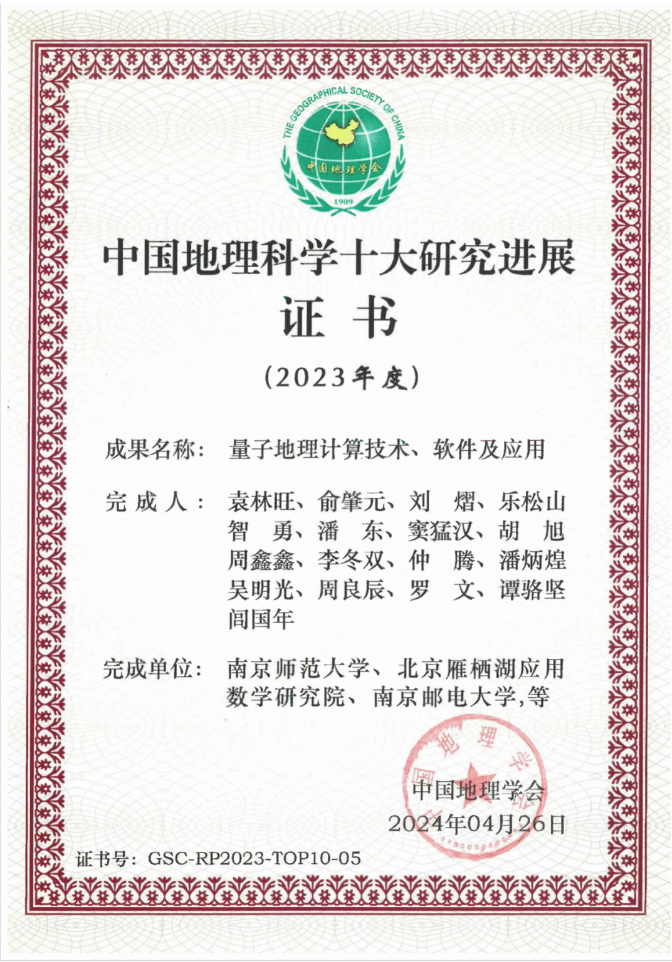 日前,中国地理学会公布了2023年度“中国地理科学十大研究进展”入选成果,太阳成集团tyc33455cc地理信息科学系研究成果《服务设施动态配置优化模型及其量子退火计算方法研究》等,作为重要支撑成果之一,支撑“量子地理计算技术、软件及应用”成功入选。