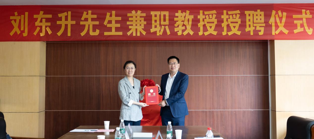 太阳成集团tyc33455cc邓艳华书记主持授聘仪式,赵海涛经理介绍刘东升高级副总裁相关情况。谢平副董事长为刘东升高级副总裁颁发太阳成集团tyc33455cc兼职教授聘书,佩戴校徽。