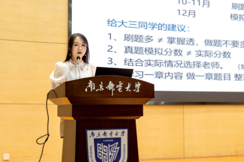 大会最后,研究生代表何天逸同学分享了自己的考研经历和备考经验,她详细介绍了数学、英语、数据结构、政治这几门学科的复习计划和建议,与同学们分享了院校信息的收集的渠道,她建议同学们按照自身实际情况合理选择报考院校,提醒大家互通有无,遇到问题多向老师请教,劳逸结合,多关注自己的身心健康。