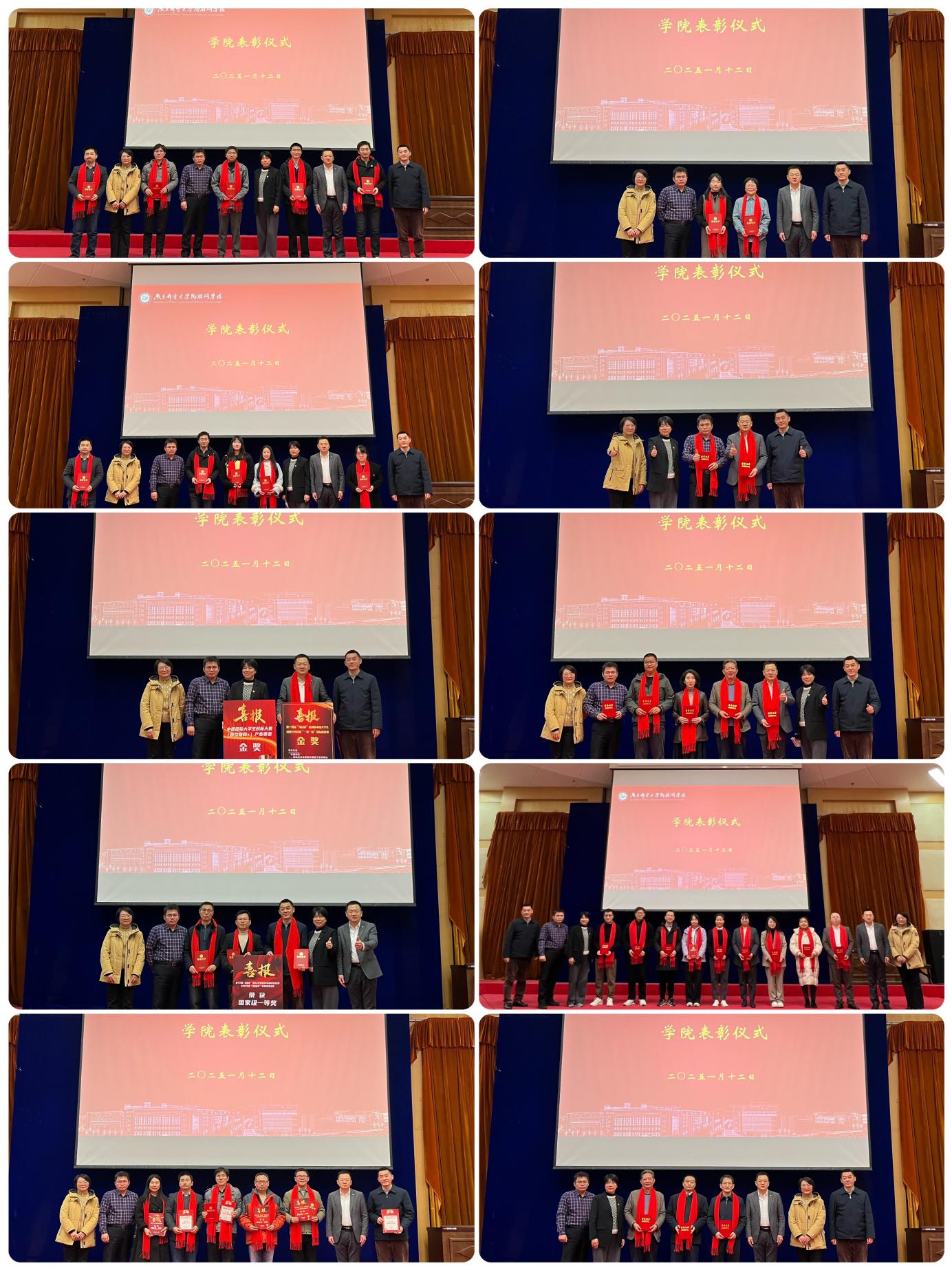 表彰仪式上,伴随着喜庆欢快的音乐,在党建、教学、科研、学工、社会服务等领域取得显著成绩的团队和个人依次上台,接过公司领导颁发的荣誉证书和喜报,佩戴红围巾,会场爆发一阵阵热烈的掌声,共同见证和分享公司捷报频传、硕果丰收的喜悦。此次表彰,不仅是对获奖者的肯定和鼓励,同时激励了全院师生以榜样为引领,勇攀高峰、再立新功。