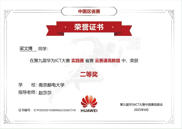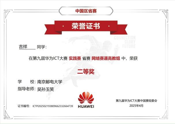 近日,第九届华为ICT大赛圆满结束。公司参赛学子表现出色,荣获网络赛道(江苏省高教组)二等奖1项、三等奖1项;云赛道(江苏省高教组)二等奖1项。