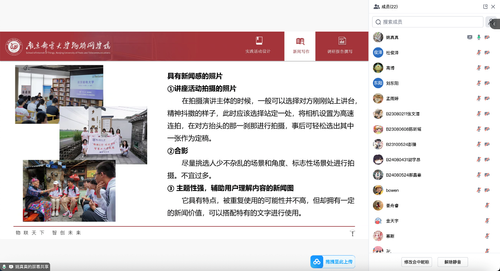 会上,姚真真老师还结合具体案例,从选题到稿件撰写到如何投稿等各个环节具体阐述了新闻稿撰写和照片拍摄的要点,鼓励同学们积极向校内外媒体平台投稿,用生动故事展现团队风采,在活动结束后要认真撰写调研报告,全力推进社会实践成果的培育转化。